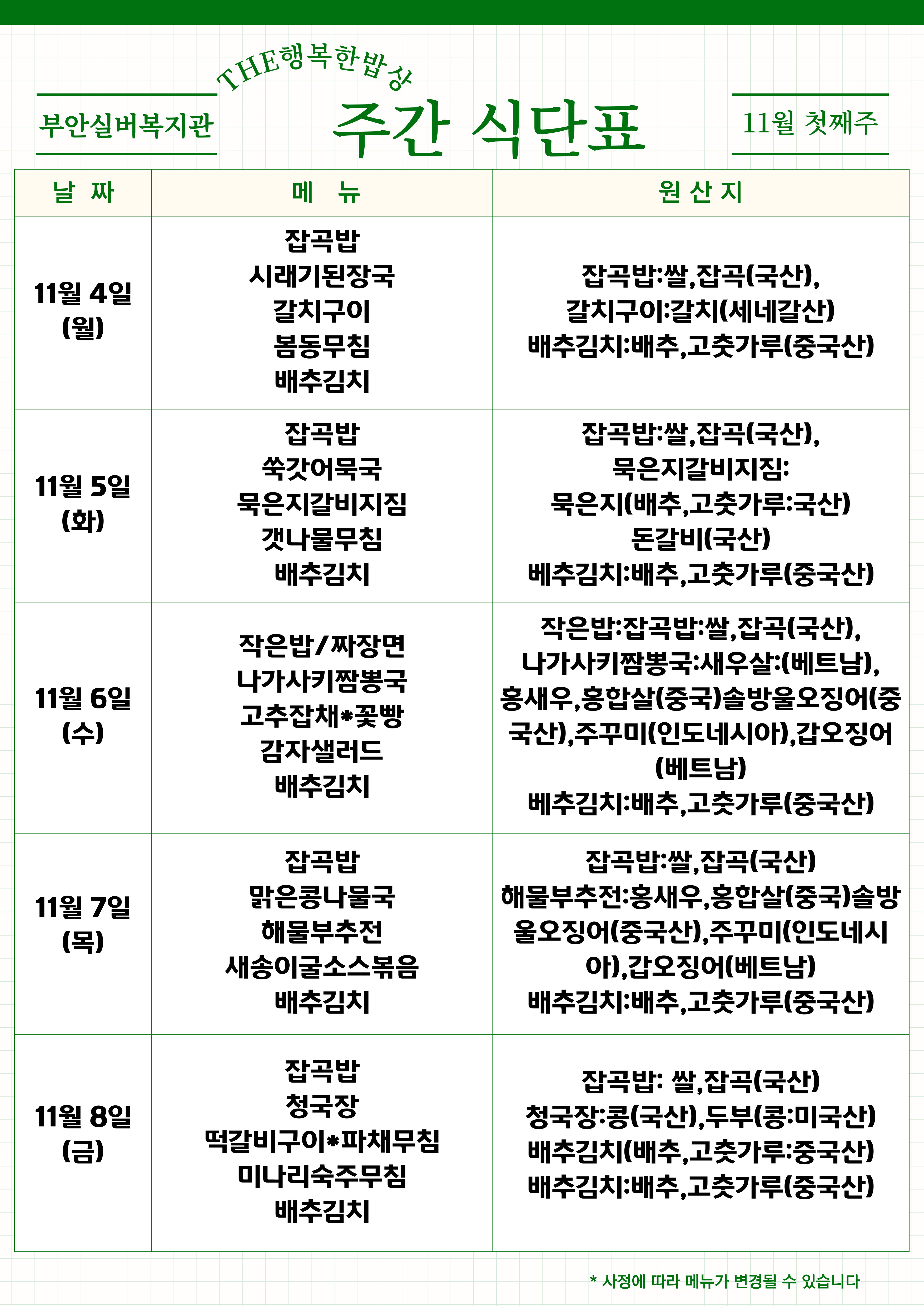 * 식단은 식재료의 수급 및 기타사정에 따라 변경 될 수 있습니다.
