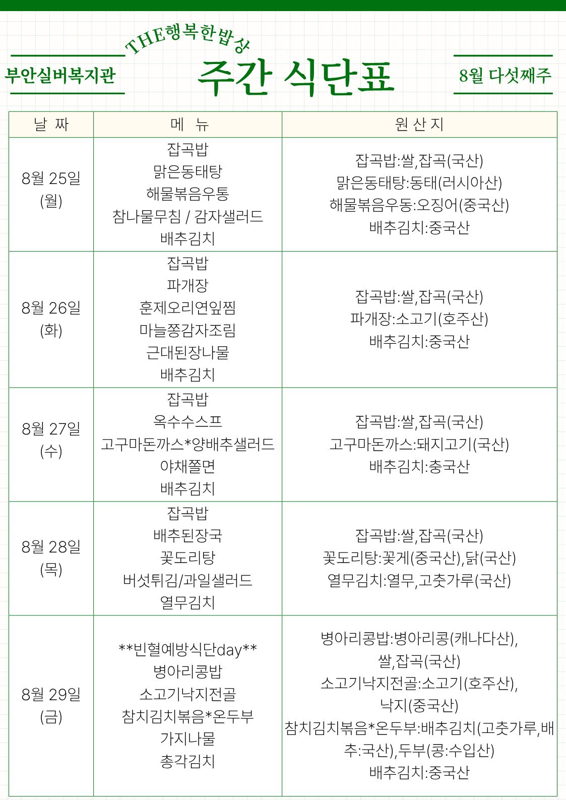 | 복지관 식단표 - 8월 1주 (0) | 2025.08.04 |