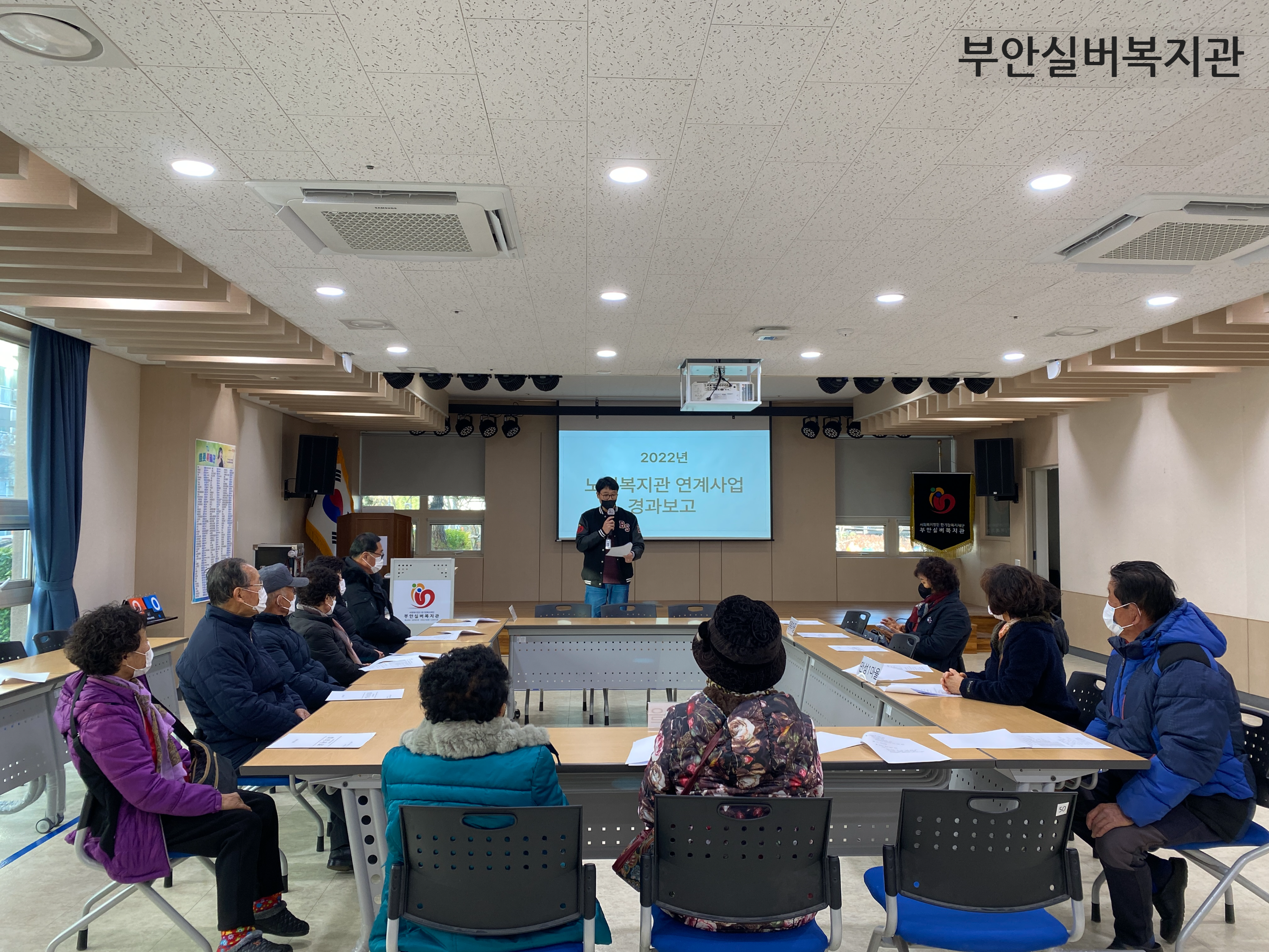 노인복지관 연계사업 임원진 간담회를 12월 6일에 진행하였습니다. 2022년에 진행된 프로그램 및 교육사업 등에 대해 경과 보고하고, 각 마을의 이장님, 노인회장님, 부녀회장님, 참여 어르신께서 프로그램에 참여한 소감과 애로사항을 들을 수 있는 유익한 시간이었습니다.