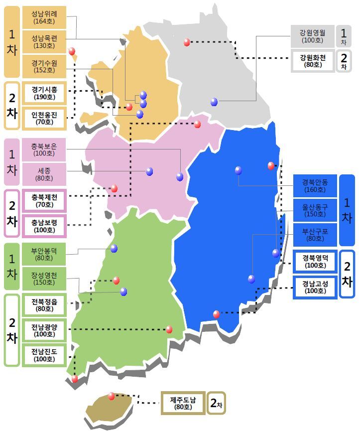 - 1차 : 성남위례, 성남목력, 경기수원, 충북보은, 세종, 부안봉덕, 장성영천, 강원영월, 경북 안동, 울산 동구, 부산 구포