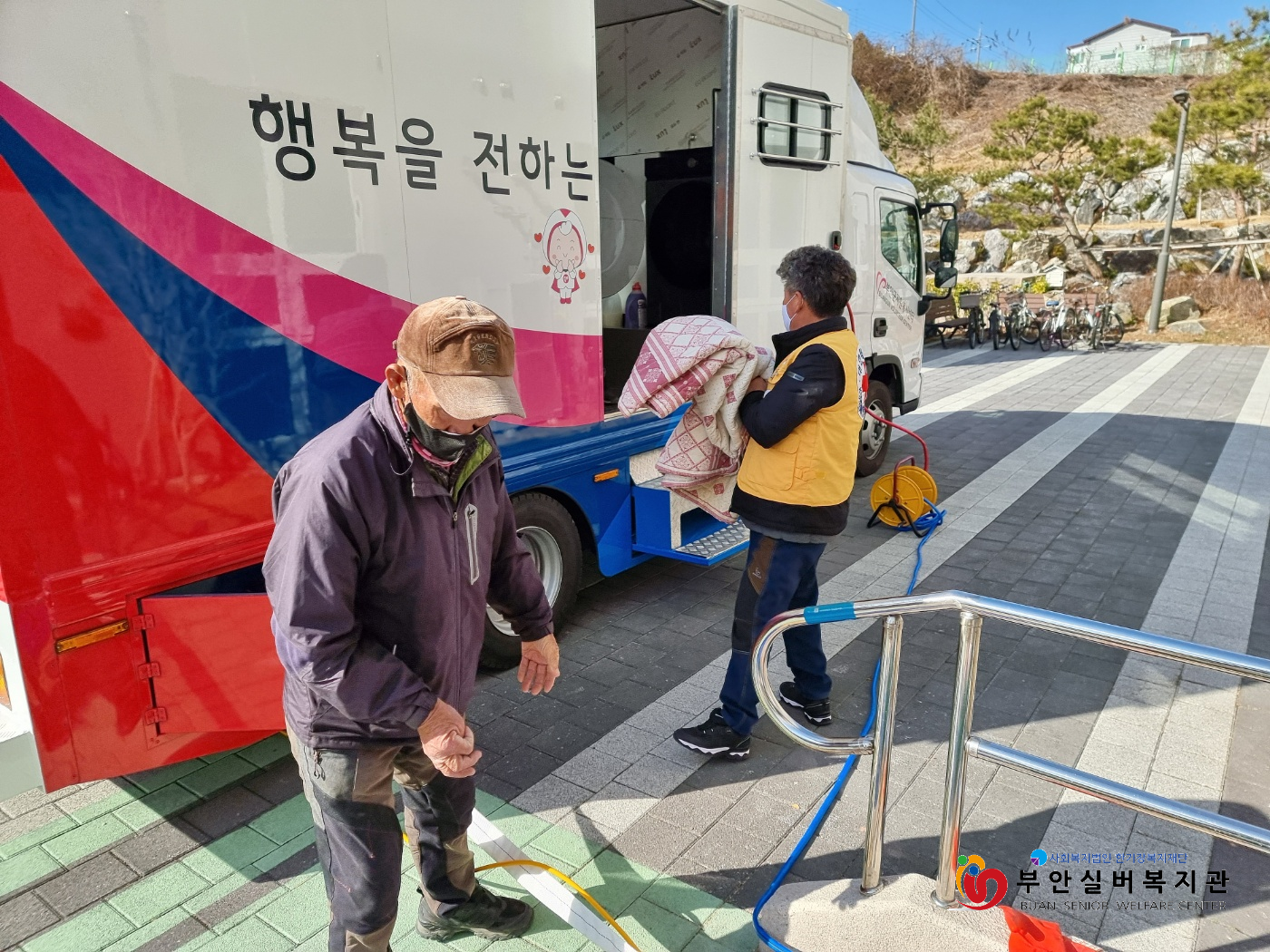 부안군자원봉사센터에서 작년에 구입한 '이동 세탁 차량 뽀송이'를 이용해서 진행한 이번 사업은 대한적십자봉사회 부안지구협의회(회장:박영숙) 회원들의 자원봉사활동이 더해져 더욱 훈훈하게 진행되었으며, 공공실버주택 어르신들의 겨울 이불 빨래 총 40세대 분량을 세탁하였습니다.