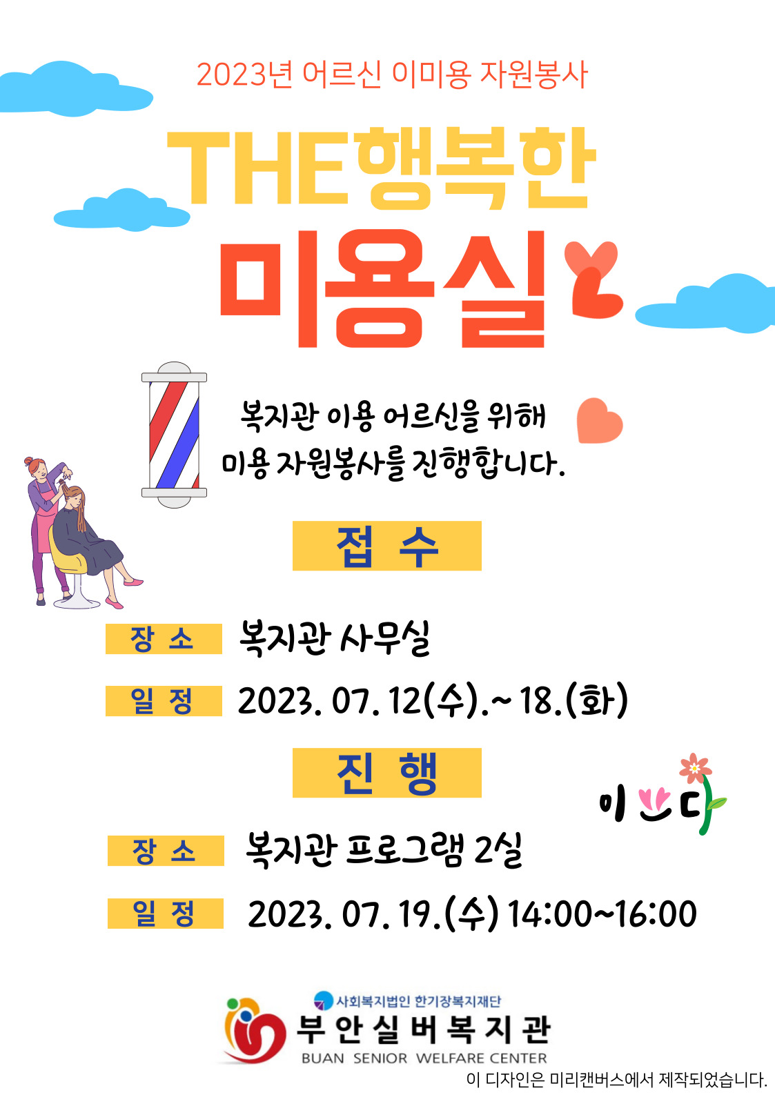 부안실버복지관에서는 복지관 이용 어르신의 건강한 노후생활을 위해 '정화미용아카데미학원'과 연계하여 이미용 서비스를 매월 세 번째 수요일에 진행합니다!