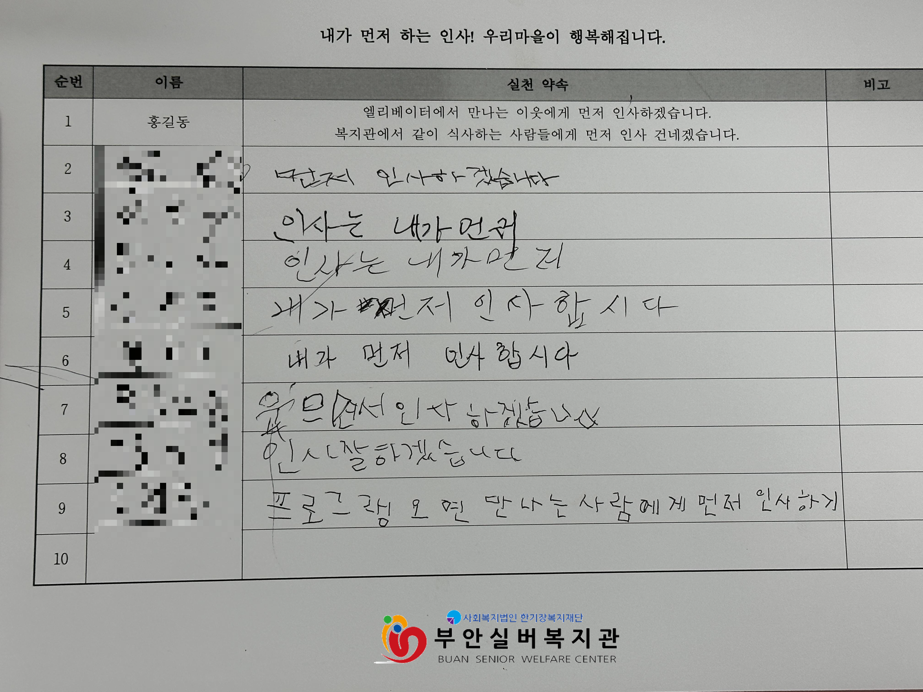 지역사회 캠페인을 통해 이웃간 인사를 나눌 수 있도록 주선했습니다. 꾸준한 인사를 통해 친밀한 이웃 관계가 형성될 것이며, 인사 나눔 문화가 확산되면 인정이 넘치는 지역사회가 되길 소망해봅니다.